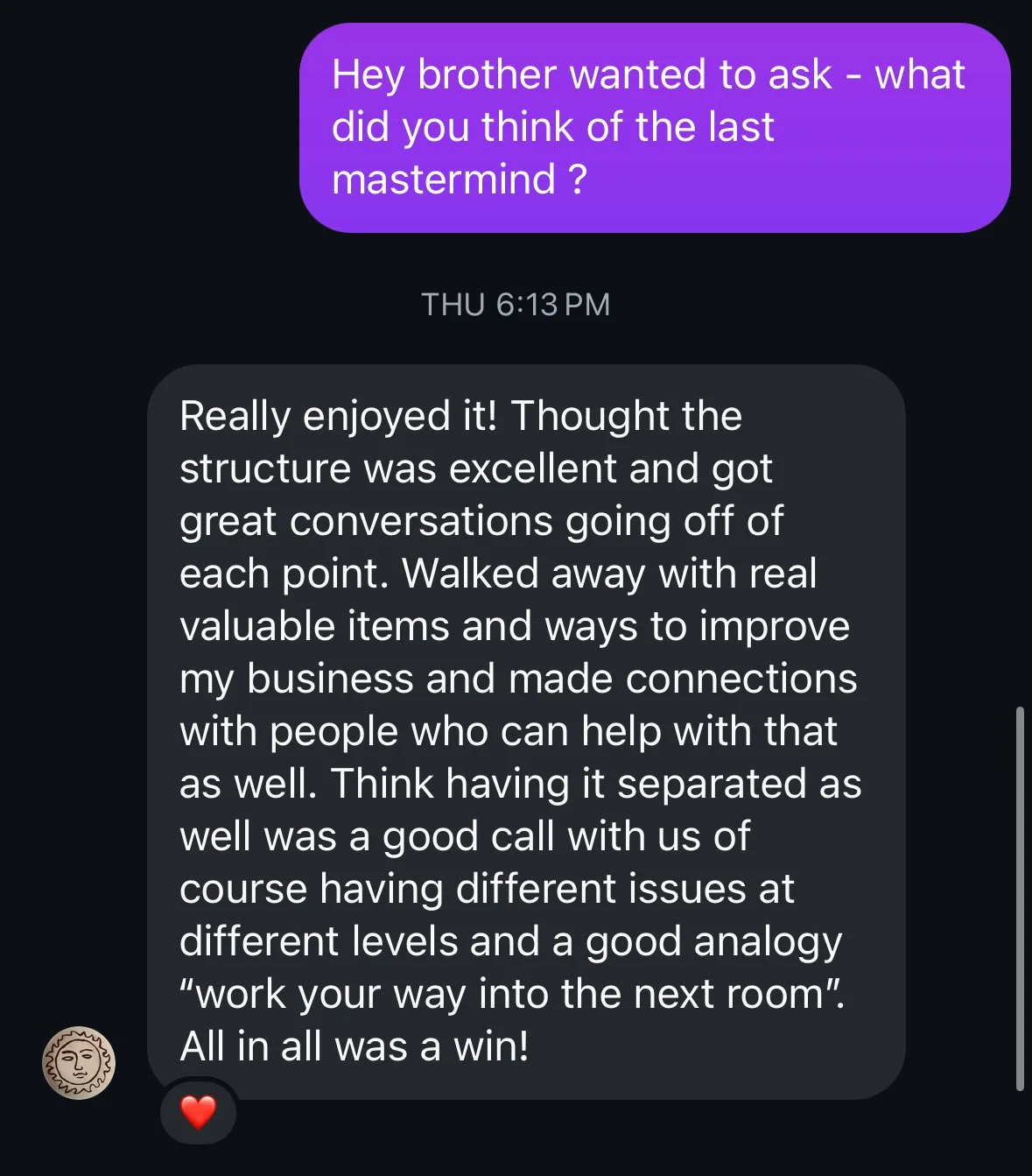 Each session ensures you stay on track with your goals through strategic updates, peer accountability, and clear next steps — driving real progress between mastermind sessions.